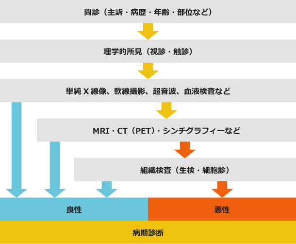 一般的な診断の進め方は以下の通りです。悪性腫瘍の可能性がある場合には、組織検査(顕微鏡検査)が必要となります。